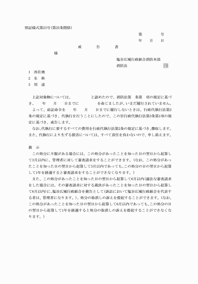2 消防長又は消防署長は、緊急に措置する必要があると認める場合で、前項の警告書を発するいとまがないときは、口頭で必要な事項について警告することができる。この場合、事後速やかに警告書を交付するものとする。